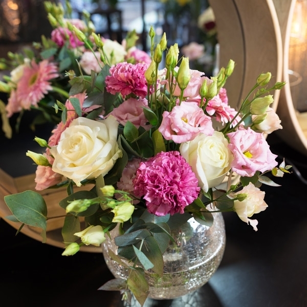Le bouquet Lido dans les tons rose est composé de Rose, de germini, de Lisianthus, de Dianthus et agrémenté de feuillage.