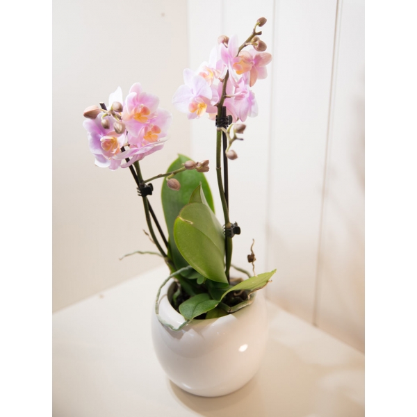 Ios est une Mini Orchidée 2 tiges dans un cache pot blanc. Vendu avec son cache pot.